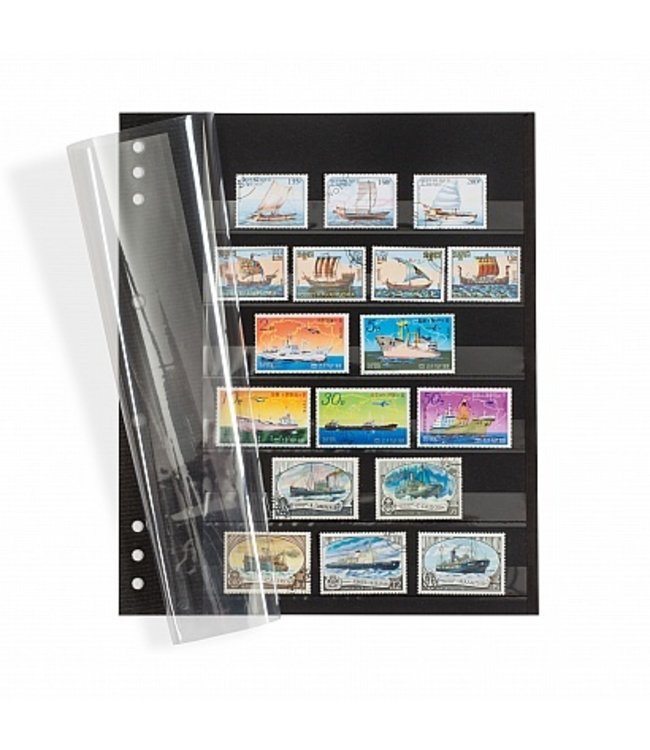 Insert stock sheets for creating individual stamp collections. Made of sturdy black carton with 6 clear strips. Front and back side. With linen hinge and double protective sheet (glassine). Suitable for all Grande binders and postbound DSN.