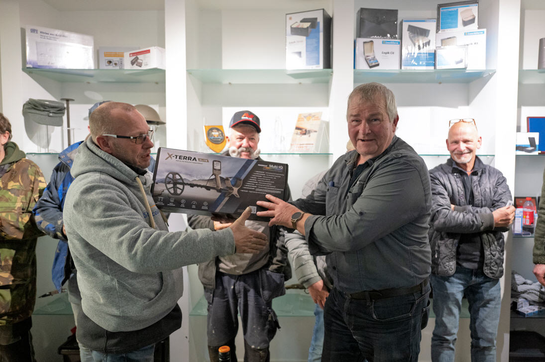 Om 15:30 uur kwam de zoekwedstrijd ten einde en kon de gezamelijke aftocht richting de showroom beginnen. In de showroom was het lekker warm, hier kon men terecht voor een borrel met hapjes, en vondt de prijsuitreiking plaats. Er waren ruim 30 prijzen te winnen waaronder enkele toppers zoals een Minelab Equinox 900, een Minelab X-terra Elite, diverse pinpointers en waardebonnen.
