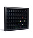 De box in minimalistisch design bestaat uit stevig karton in matzwart met vast geïntegreerde scheidingswanden. 60 vakjes van 50 mm x 36 mm x 33 mm bieden voldoende ruimte. Dankzij de constructie zijn alle verzamelobjecten ook in gesloten toestand zichtbaar. Het deksel kan worden opengeklapt, heeft een groot kijkvenster en sluit met een onopvallende magneetsluiting – zo is de collectie goed beschermd en tegelijkertijd aantrekkelijk gepresenteerd. Door oogjes aan de achterkant kan de box zowel horizontaal als verticaal worden opgehangen (bevestigingsmateriaal is niet bij de levering inbegrepen).